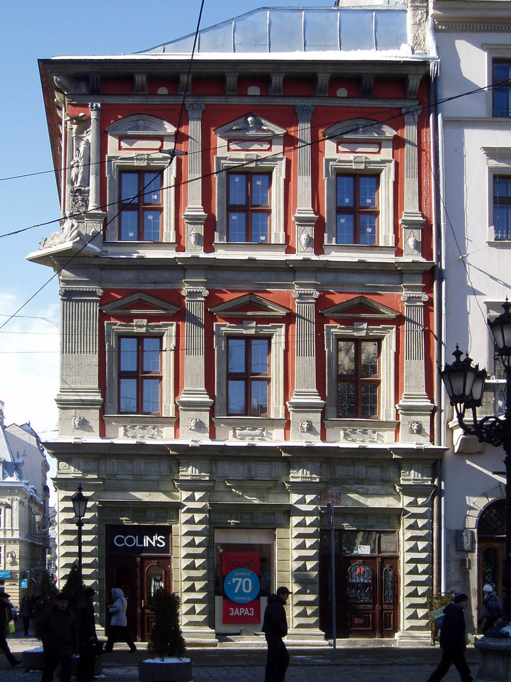 Довгий прямокутник коралового кольору знизу оброблений рустівкою йде вздовж у бік Латинської катедри. Купецький будинок зберігся краще за багатьох інших на площі, тому що до нього не були добудовані додаткові поверхи після зняття заборони. Завдяки цьому будинок зберіг свої первісні пропорції та оригінальний вигляд 16 століття. Проте внутрішнє оздоблення будинку та планування кімнат втрачено у реконструкції 19 століття.