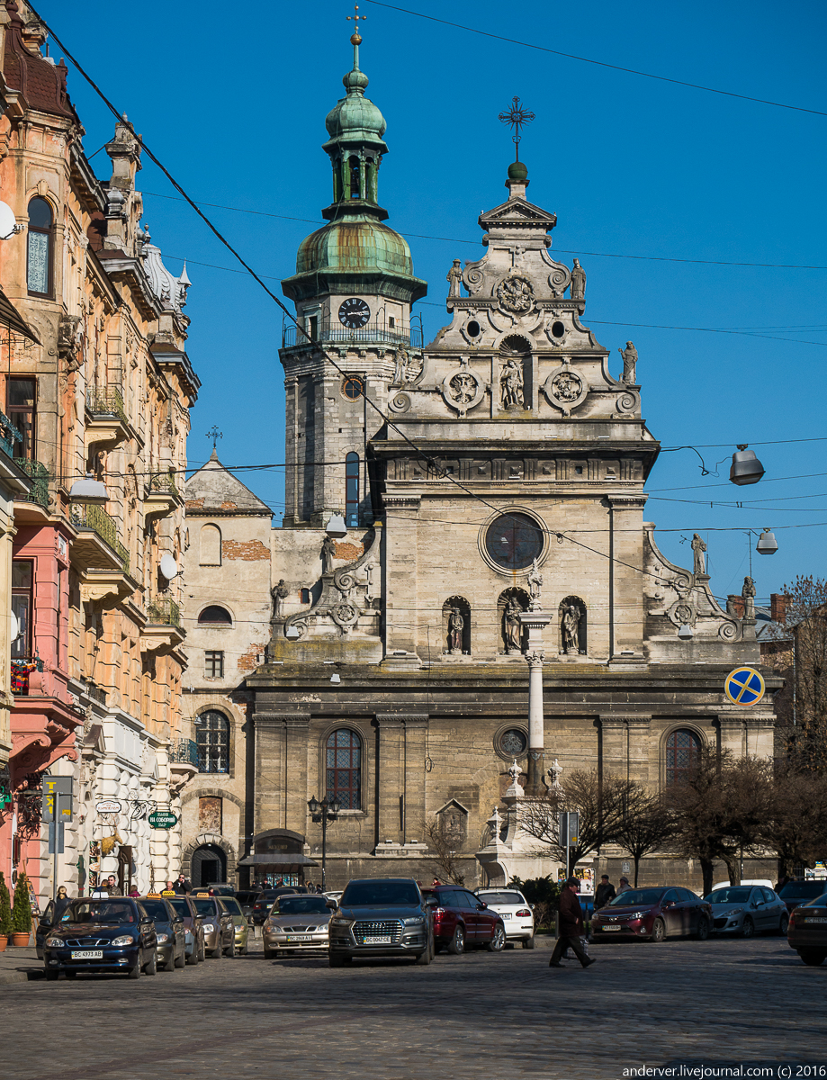 Праворуч від Ратуші знаходиться вежа Латинської катедри. Цей римо-католицький костел виконаний в стилі європейського бароко, символізує польську, католицьку частину Львова.