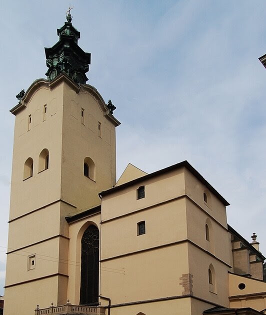 Зліва вгадується контур відомої вежі Корнякта. Це символ українського Львова і православної церкви. Вежа була побудована Петром з Барбони и Павлом Римлянином на кошти багатого грецького купця Костянтина Корнякта, тому названа в його честь. Вежа є частиною ансамблю Успенської церкви.