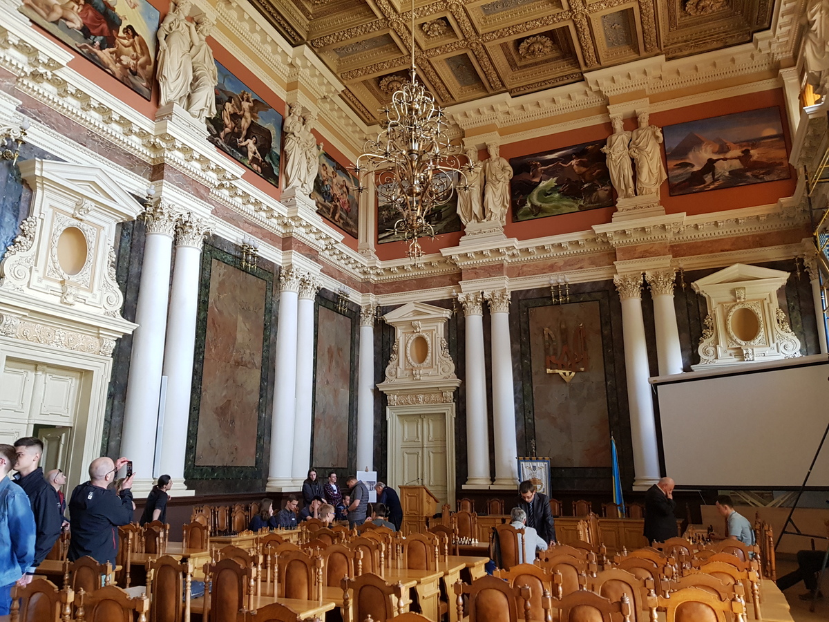 Одним із найкрасивіших приміщень в університеті вважається актова зала. Вона розписана і прикрашена на кшталт палацових залів. Полотна в актовому залі головного корпусу ілюструють технічний прогрес. Всього там знаходиться 11 написаних олією картин, які створені у 1880-х роках видатним польським художником Яном Матейком.