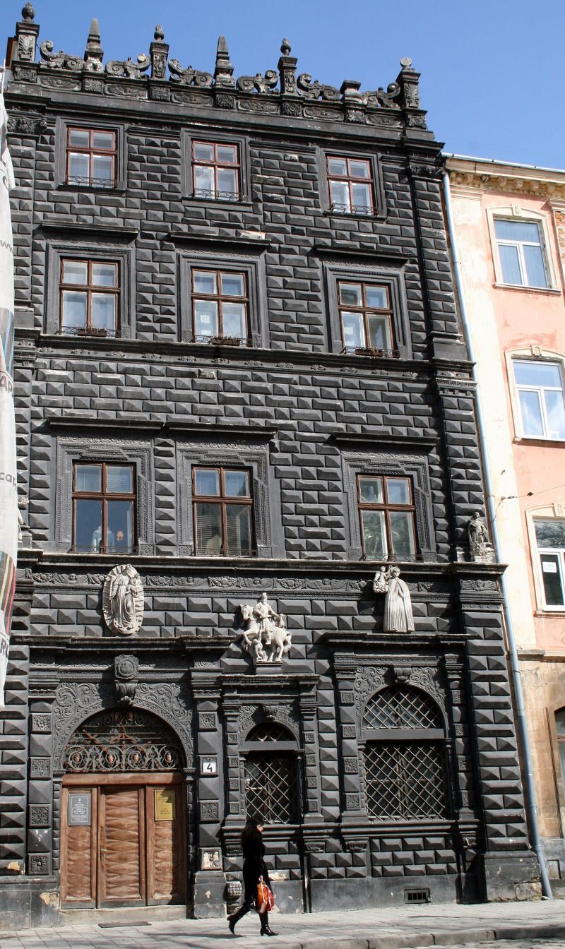 Одним із найяскравіших прикладів є Чорна кам’яниця (будинок №4), збудована в 1577 році. Її фасад, потемнілий від часу й покритий різьбленням, нагадує венеційські палаццо. Кажуть, що темний колір — це не лише природне старіння каменю, а й результат спеціальної обробки свинцевими фарбами, якими власник, львівський аптекар Ян Лоренцович, хотів підкреслити свій статус. Всередині ховаються таємничі підвали, де, за легендами, алхіміки шукали безсмертя та намагались створити філософський камінь.