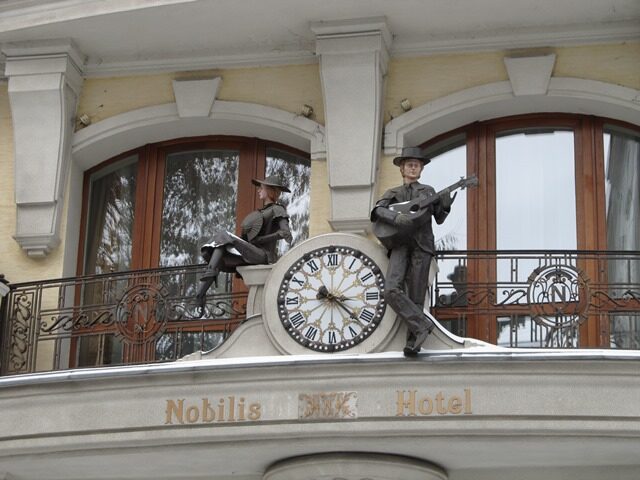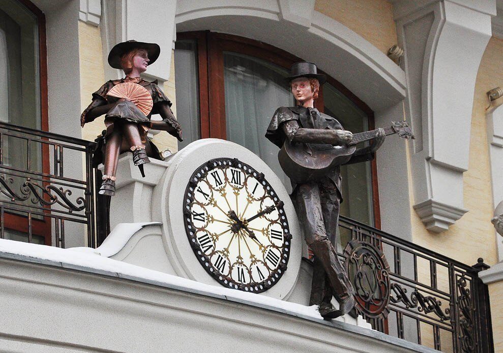 А цю цікавинку можна побачити на вулиці Герцена, 8. «Годинник закоханих» – справжній театр під відкритим небом. Створений за задумом авторів як любовна історія, він оживає кожні 92 хвилини: юнак-менестрель грає на гітарі, дівчина ховається за віялом, а потім дарує йому троянду.