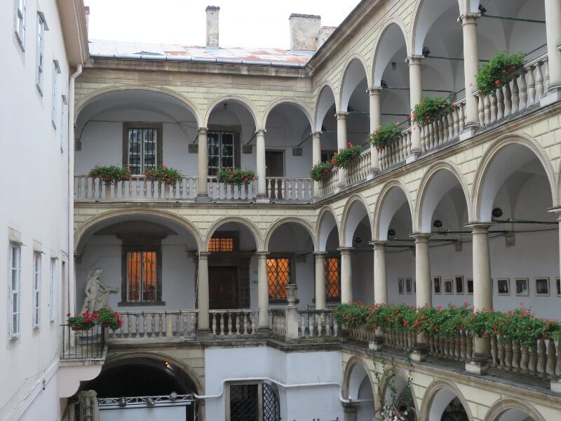 Але справжньою перлиною палацу завжди було “італійське подвір’я” – той самий дворик із ренесансною аркадою, що тягнеться на три яруси. До XX століття його частково позакривали якимись флігелями XIX століття, але в 1926–1929 роках архітектори Людомил Дюркович і Вітольд Дайчак узялися за справу й повернули аркаді її первозданну красу. Кожен ярус тримається на колонах іншого стилю: приземлені тосканські внизу, строгі доричні посередині й витончені іонічні нагорі. Цей дворик – наче шматочок Венеції чи Флоренції у Львові. Сьогодні це місце обожнюють і місцеві, і гості міста. Тут знімають фільми, грають концерти студенти консерваторії, а іноді навіть влаштовують театральні вистави просто неба.