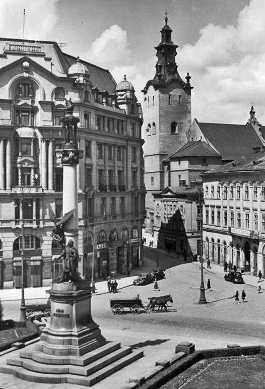 На початку 20-го століття львівська польська спільнота вирішила вшанувати свого великого поета Адама Міцкевича, поставивши йому пам’ятник. Його планували розмістити там, де зараз стоїть фігура Богоматері, оскільки це місце забезпечило б видатну домінанту в центрі міста. Однак, дослідження показали, що підземні склепіння річки Полтви, яка протікає під цим місцем, не витримали б ваги такої структури.