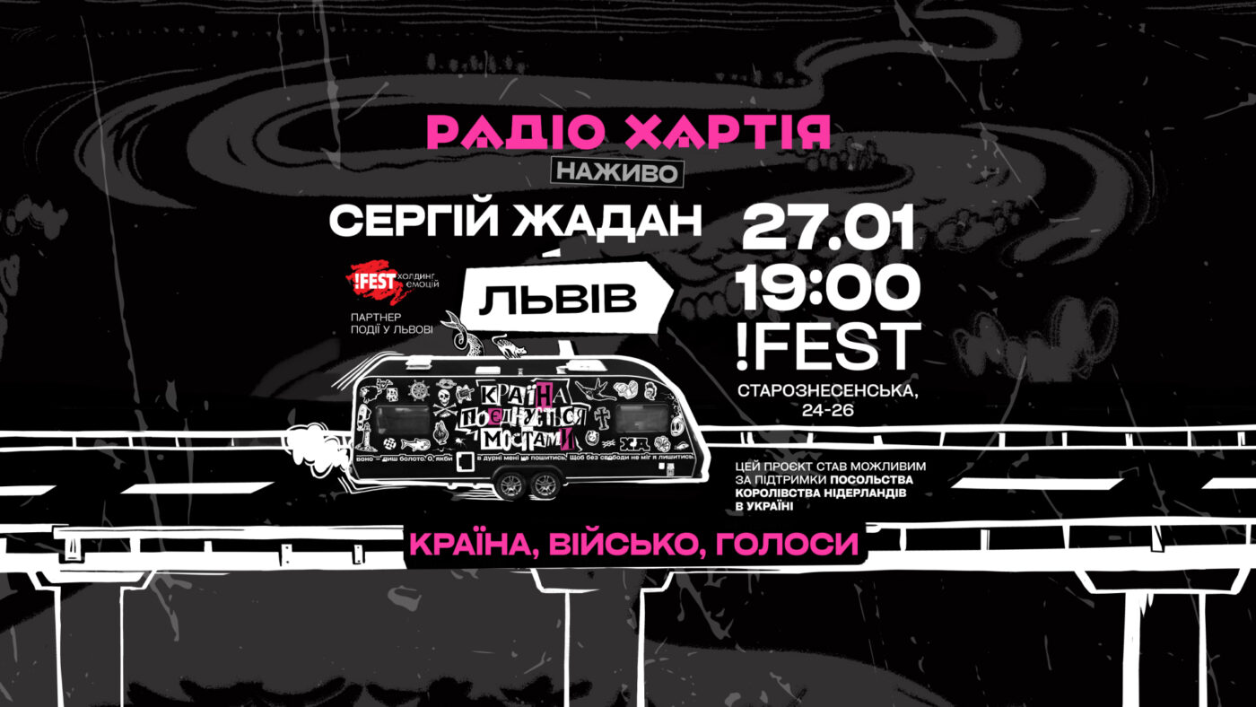 «Країна поєднується мостами»: під таким гаслом Сергій Жадан і Радіо Хартія, «добрі пірати радіоефіру», мандрують Україною та запрошують поговорити про речі, які нас об’єднують, послухати добру музику та налаштуватися на роботу і боротьбу у 2026 році. Радіо є тим мостом, який легко перекидається з краю до краю країни, в тому числі між Харківщиною і Львівщиною, говорить Сергій Жадан.