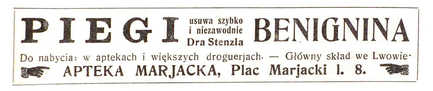 На початку ХХ століття у Львові з’явився ще один косметичний хіт, а саме крем “Benignina”, створений фармацевтом Стефаном Стенцелем. Його аптека на площі Ринок стала не лише місцем для ліків, а й справжнім салоном краси. “Benignina” обіцяв майбутнім клієнтам усунути веснянки, засмагу, висипання й лишай, надаючи шкірі “матовість і молодечу свіжість”. В чому ж був секрет?